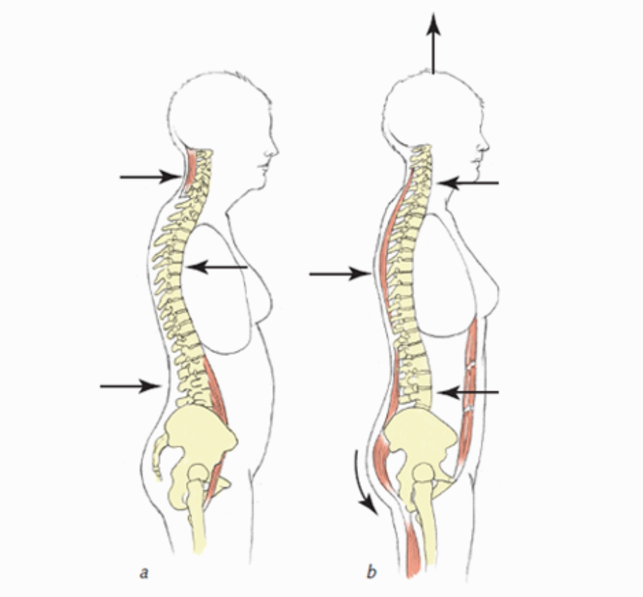 脊椎還有一種動作:軸向伸展(axial extension),同時減少了原發性和繼發性的弧度,也就是說,頸椎、胸椎、腰椎的弧度通通都減小了,造成的結果,就是整條脊椎一起拉長。