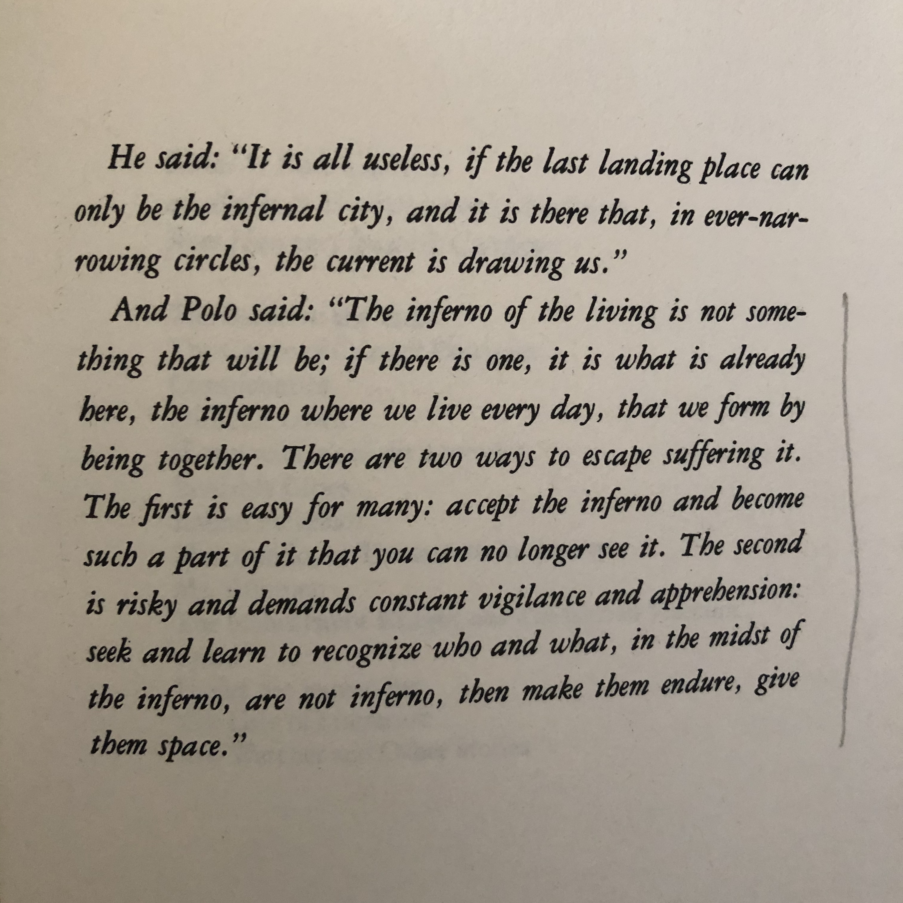 生靈的地獄,不是一個即將來臨的地方;如果真有一個地獄,它已經在這兒存在了,那是我們每天生活期間的地獄,是我們聚在一起而形成的地獄。有兩種方法可以逃離,不再受苦痛折磨。對大多數人而言,第一種方法比較容易:接受地獄,成為它的一部份,直到你再也看不到它。第二種方法比較危險,而且需要時時戒慎憂慮:在地獄裡面,尋找並學習辨認什麼人,以及什麼東西不是地獄,然後,讓它們繼續存活,給它們空間。