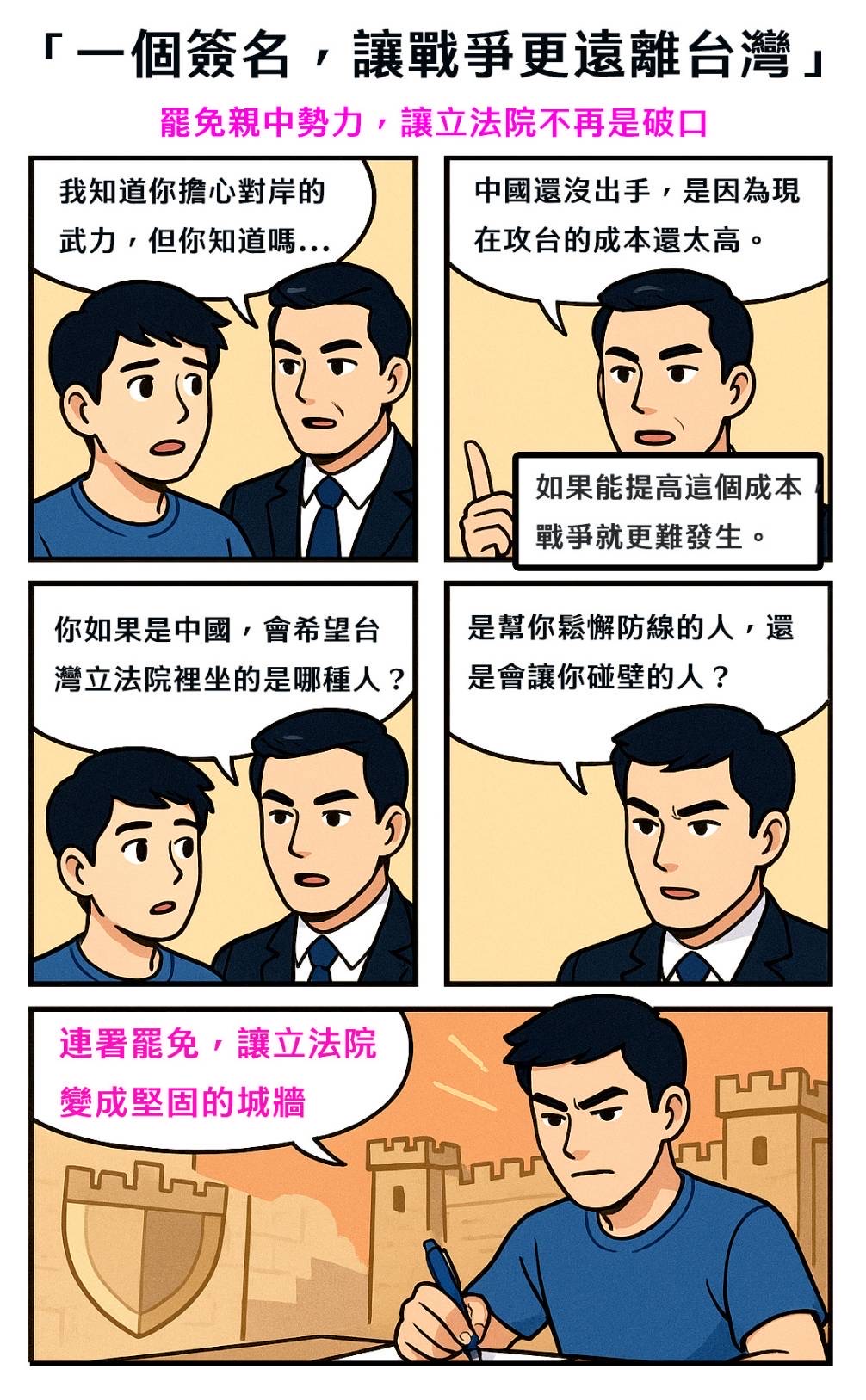 現在還來得及。最後的一兩個星期,還有時間能連署,還能再多拉一個兩個十個百個人出來連署。二階連署能過關,才能投罷免票。罷免案能贏,才有下一次再投票的資格。能拿筆、能上網連署,怎麼樣也比拿槍對戰、躲子彈飛彈容易得太多了。