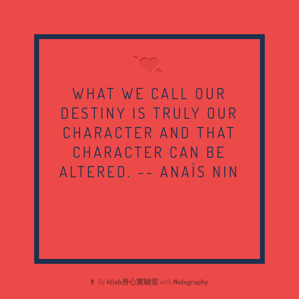 我們稱為命運的這玩意兒,其實就是我們的性格,而且,性格是可以改變的。我們知道我們要對自己的行為和態度負責,這件事並不需要讓我們洩氣,因為這也意味著我們可以改變自己的命運。過往的經驗形塑了一個人,但我們大可以不受制於過往的經驗、種族、遺傳、背景環境。只要我們有勇氣去檢視這些事物是如何形塑我們的,我們就可以改變這一切。只要我們有勇氣去剖析這些因素,我們就可以改變自己的性格。 – Anaïs Nin