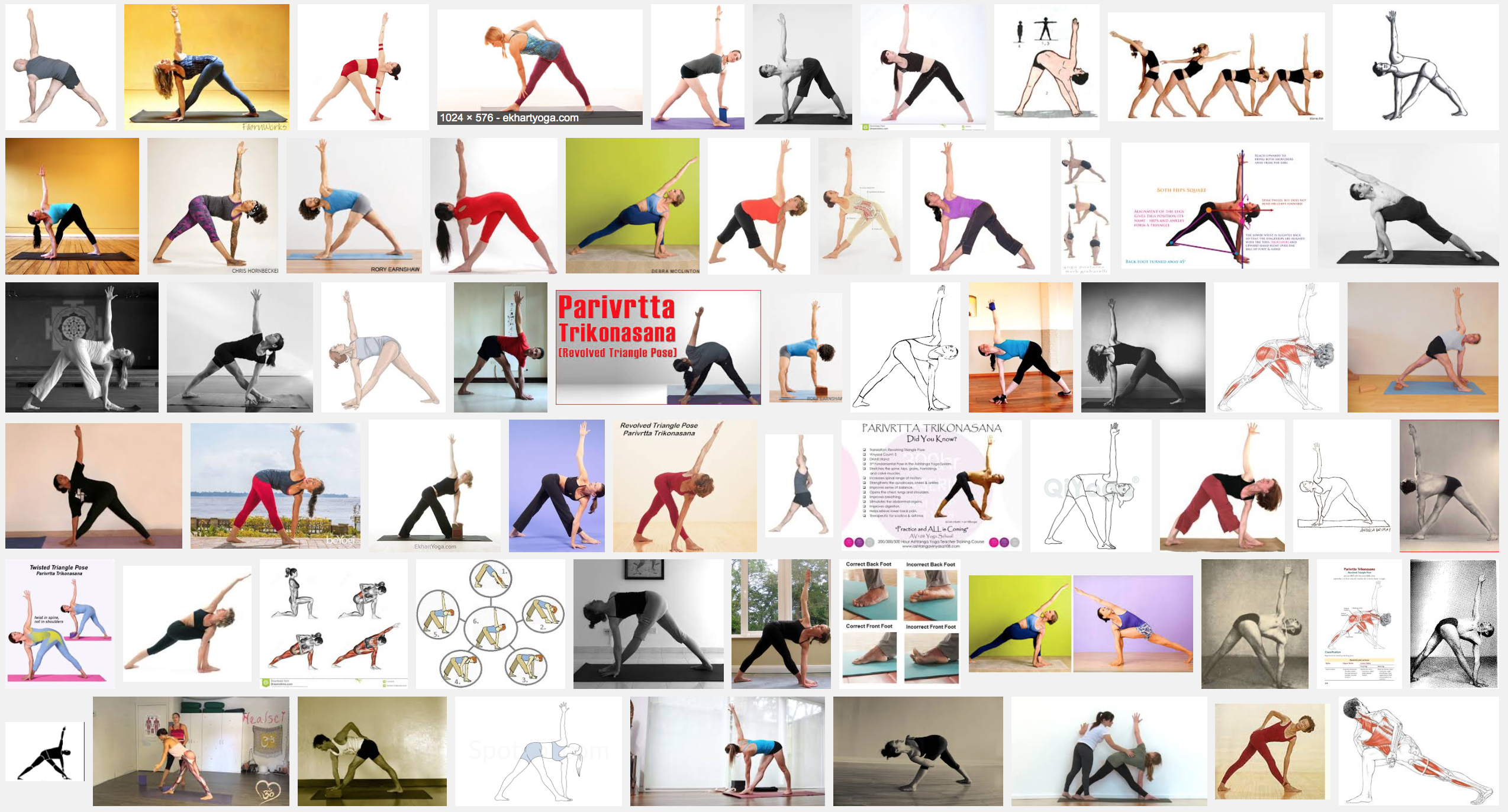 如果繼續下去,到形式上更複雜的扭轉三角式(parivrtta trikonasana),細節更多,選擇更多。前後腳的距離、角度要多大?骨盆要穩定不動還是跟著扭轉?兩條手臂的相對位置應該怎麼抓?前後手掌要「到達」什麼位置?頭呢?頭往哪裡轉?脊椎呢,頸椎、胸椎、腰椎、荐椎、尾椎的活動各是什麼方向?整個人的重心會落在什麼地方?又可以往什麼方向移動?如何進入這個動作,是腳先擺好、底下的手放好,再打開胸口、打開上方的手臂?還是站直穩定之後,兩手往上或往外打開然後往軀幹慢慢前進?該從頭到尾關注呼吸,還是先讓地基、重心穩定?注意力的範圍要多大,焦點又該在什麼地方?