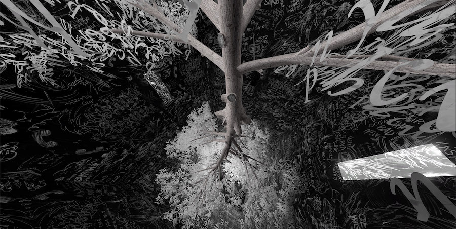 一樣是飛翔在字母構築的大樹、Laurie Anderson 已過世的愛犬的「中陰身」形象,還有各個巨大無比的建物與房間、通道。一樣是純黑白的場景。但又不是。一切開始幻化。我腦子裡自己創造出的房間,前一陣子看的電影、其他展覽,更早以前讀過的書籍,片段瑣碎的記憶。